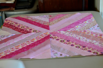 I'm joining in the rainbow scrap challenge at SoScrappy and January's color was pink. I am going to make my granddaughter, Victoria, a rainbow string quilt. The blocks will not be laid out like this in the quilt, but here are the pink blocks I made this month. I plan to do 4 blocks of 5 different colors. I'm thinking pink, blue, yellow, green, and purple.